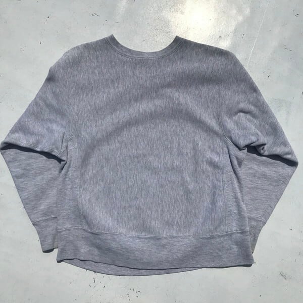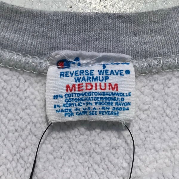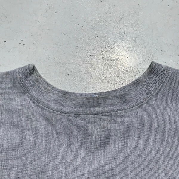 80年代後半頃のChampionリバースウィーブスウェットです。杢グレーにMICHIGANの染み込みプリントが入ります。コットン89%アクリル8%レーヨン3%表記でトリコタグでいう後期頃の物と思われます。首リブと左リブに小さな小穴がございます。定番といえるミシガンプリントは人気も高いですが、XL以上の大きいサイズが多くゴールデンサイズはなかなか出ないのではないでしょうか。MEDIUMサイズですので男女問わずに着用しやすい1着です。