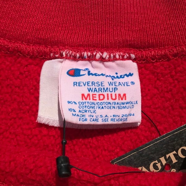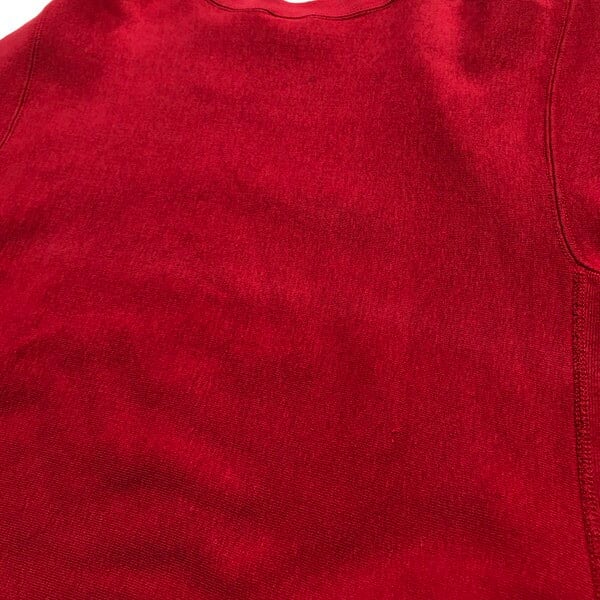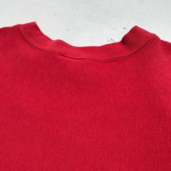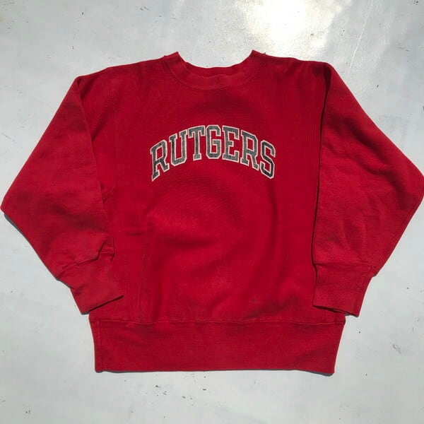 80年代後半頃のChampionリバースウィーブスウェットです。赤ボディにニュージャージー州にあるラトガース大学を意味するRUTGERSのプリントが入ります。コットン90%アクリル10%表記でトリコタグでいう中期頃の物と思われます。2枚タグとなっており、カレッジ別注等でカラーバリエーションが増えた事での注意事項が追加されたようです。プリントに擦れ、フロントに黒いシミが2箇所程ございますがダメージは特になく撚れも少ないです。MEDIUMサイズですので男女問わずに着用しやすい1着です。