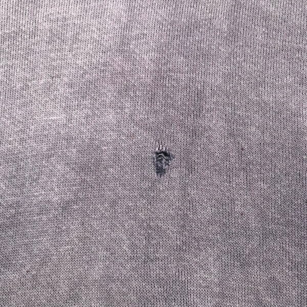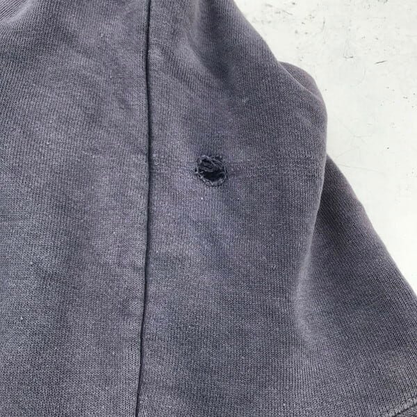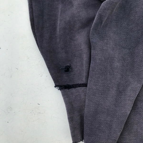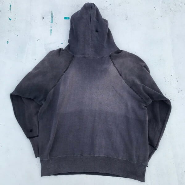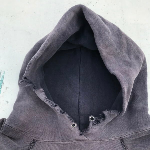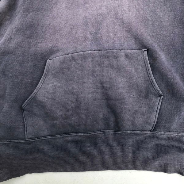 50年代から60年代頃のスウェットパーカーです。メーカー名は不明。全体に凄まじいフェードがあり、ヴィンテージラヴァーにはおなじみのナス紺ボディが堪らない1着です。フード周りや袖口、その他ダメージがありますが、ナス紺カラーと相まってグランジ感が漂います。少しセンターからずれたフロントポケットがよいアジを出しています。ハトメが取れかけていた李、所々に穴あり。背面ラグランステッチにリペアございます。ここまでのグラーデション物はなかなか探すと見つからないのでダメージ有りの雰囲気系ですがかなりおススメな1着です。