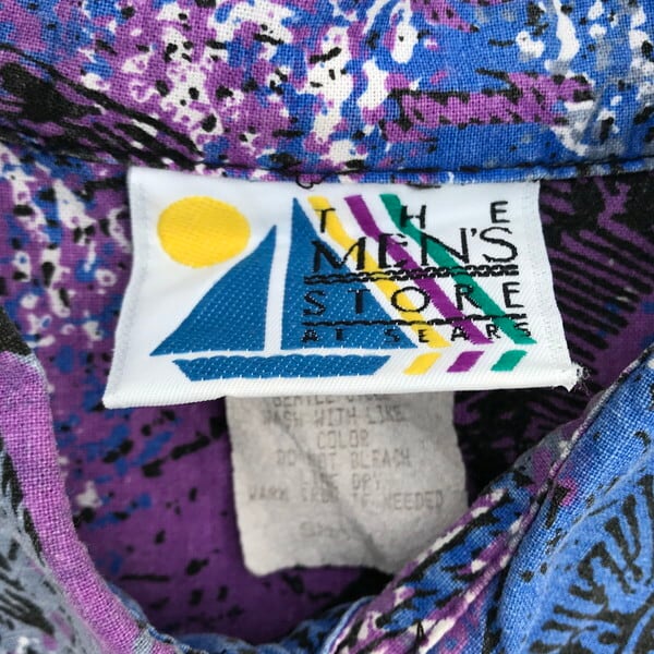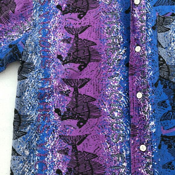 90's Sears シアーズ プリントコットンシャツ VICIOUS FISHES パープル ブルー ピラニア スカルフィッシュ ストア系 SMALL 実寸M~L USA製 希少 ヴィンテージ