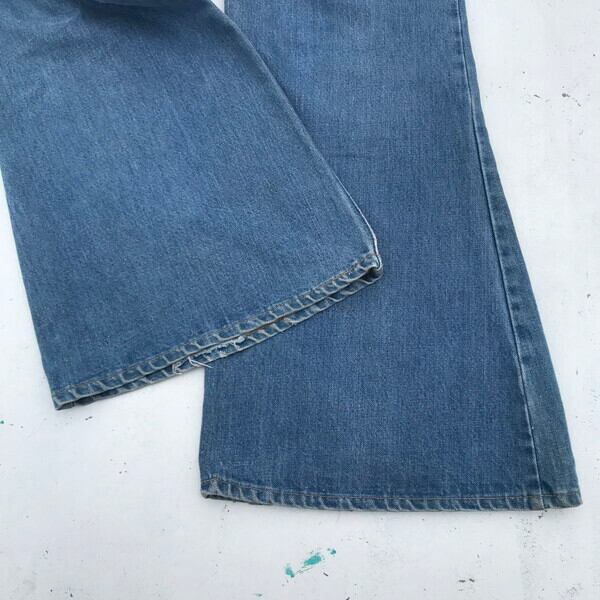 70年代のLevi's684ベルボトムデニムです。裾に向かい大きく広がったBIG BELLタイプで70年代らしいシルエットが特徴的な1本。全体に色落ちしており、この時期にピッタリな淡いアイスブルーとなっております。リペアこそございませんが、ステッチ飛びや、股部分に擦れたダメージがございます。サイズは大き目でおおよそW35位ございます。大き目サイズをお探しだった方は必見です。
