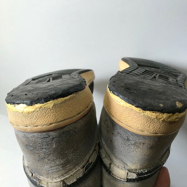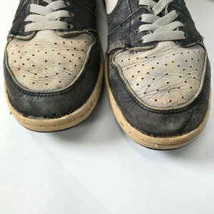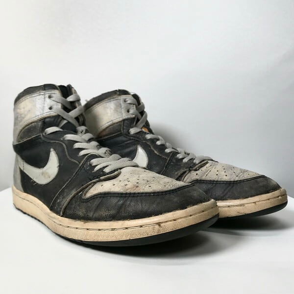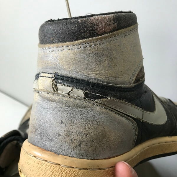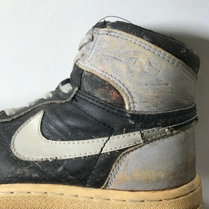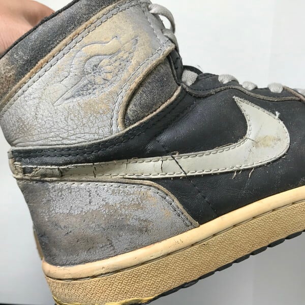 80年代のNIKE AIR JORDAN1 SHADOWです。つま黒等と並びなかなか中古市場でも見かけない黒灰の通称シャドーと呼ばれるモデルの当時のオリジナルです。ジョーダンシリーズの中でもシックなカラーリングが人気のモデルです。履き口内側の印字は消えてしまっていますが、85年当時物と思われます。全体にかなりの使用感が見られ、アッパーのスレ、ダメージも多く、スウッシュの一部が欠けたり、ソールもシューグーでリペアされています。つま先もボンドで補修された形跡がございます。しかし長きにわたり使用されていたからかソールの硬化も少なく履き口のスポンジも劣化はあるものの硬化しきっておらずまだまだ着用可能範囲と思われます。希少カラーですがJUNK扱いの為大変お手頃価格ですので、コレクション用にいかがでしょうか?サイズは恐らくUS9~9.5。※古いものですので、あくまで観賞用としてお買い求めください。