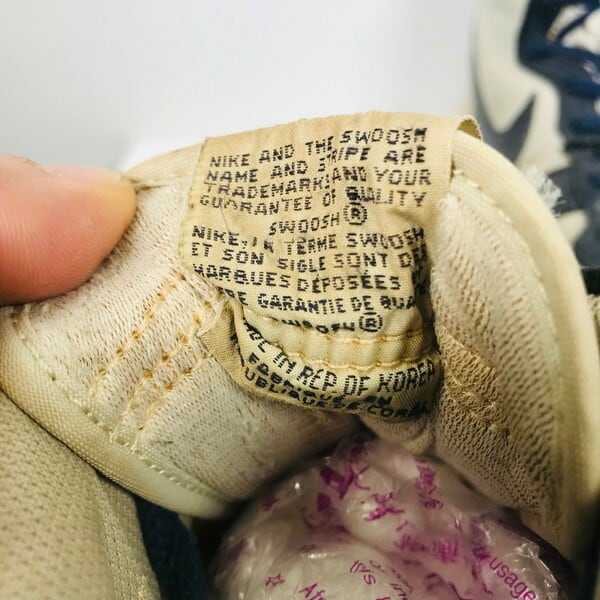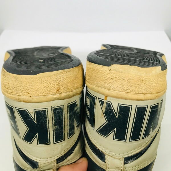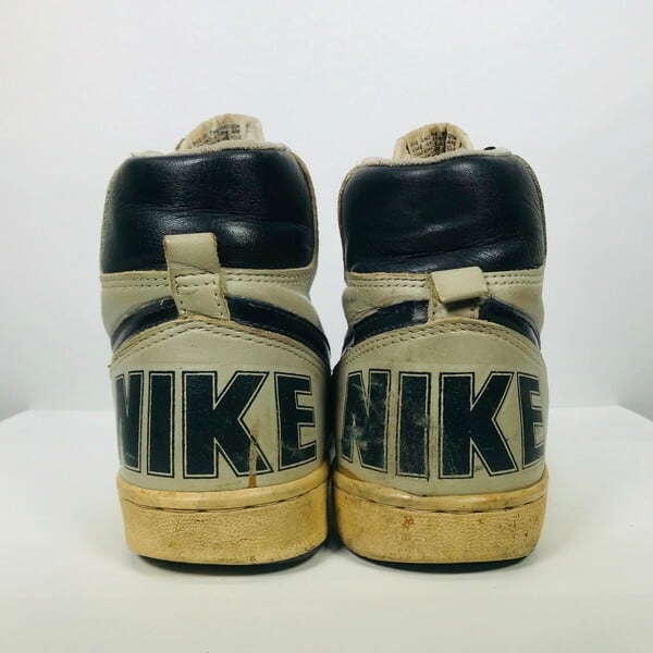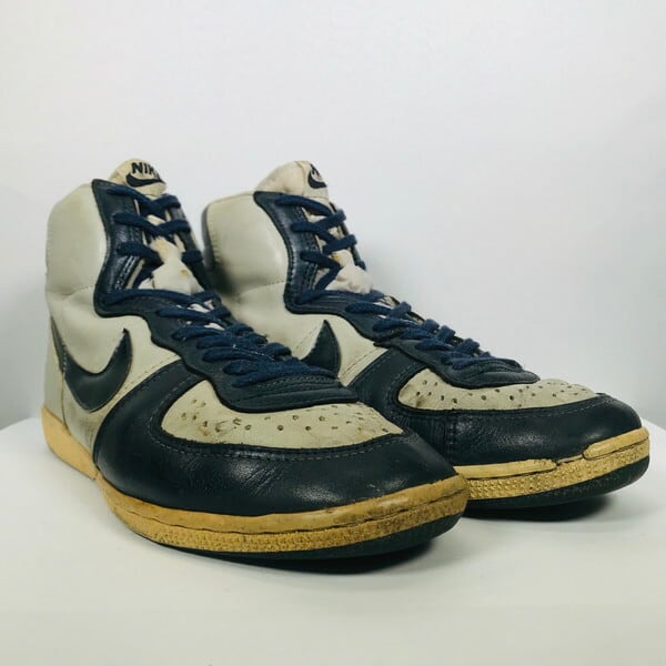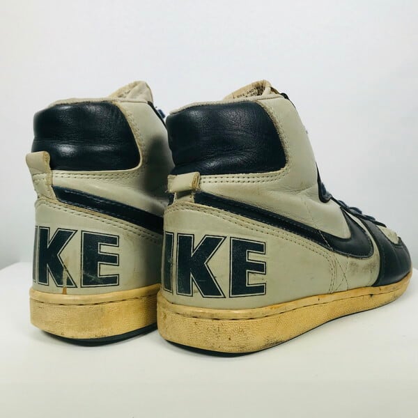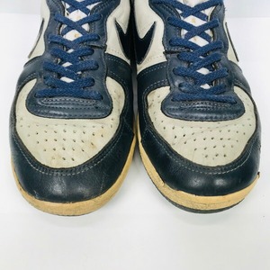 80年代のNIKE TERMINATOR HIオリジナルです。ターミネーターの代表カラーといっても過言では無い紺×灰のオリジナルは85年に登場しました。その人気から幾度と復刻されましたが、やはり当時のオリジナルとなると希少性も高く、完品ですと10万オーバーもくだらない名品です。履き口の印字はかなり消えかけていますが、サイズは恐らくUS9ハーフ。85年のモデルと思われます。アンクルパッドのスポンジはまだ柔らかいですがソールが若干硬化しており、つま先辺りに欠け等もございます。JUNK扱いですが、コレクタブルな1足ですので、是非ディスプレイ等にいかがでしょうか。※古いものですので、あくまで観賞用としてお買い求めください。【全高】13.8cm【ヒール】2.5cm【アウトソール】28.7cm