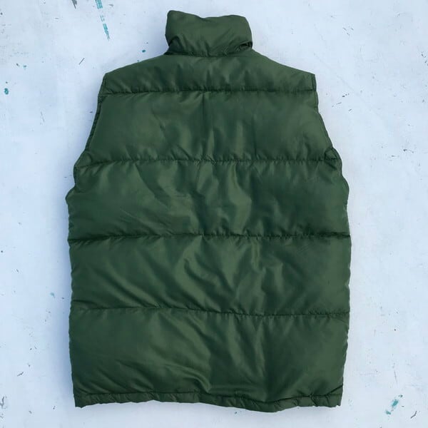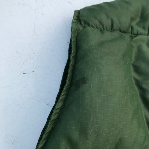 70年代のTHE NORTH FACEダウンベストです。茶タグの付く初期のモデルでサイズ表記以外にはUSA MADEの表記も無く、スナップは無刻印ボタンで、ポケットがラウンドタイプとなっています。スタンドカラーにはボタンは付属しない非常にシンプルながら完結したデザインです。人気のグリーンで、ボディはナイロンのリップストップ。所々に小さなシミやスレが有り、背面に小さなピンホールがございます。羽根抜けも多少見られますが、年代を考慮してもまだまだ綺麗な1着です。サイズはSサイズですが着用感はM程あるゴールデンサイズ。