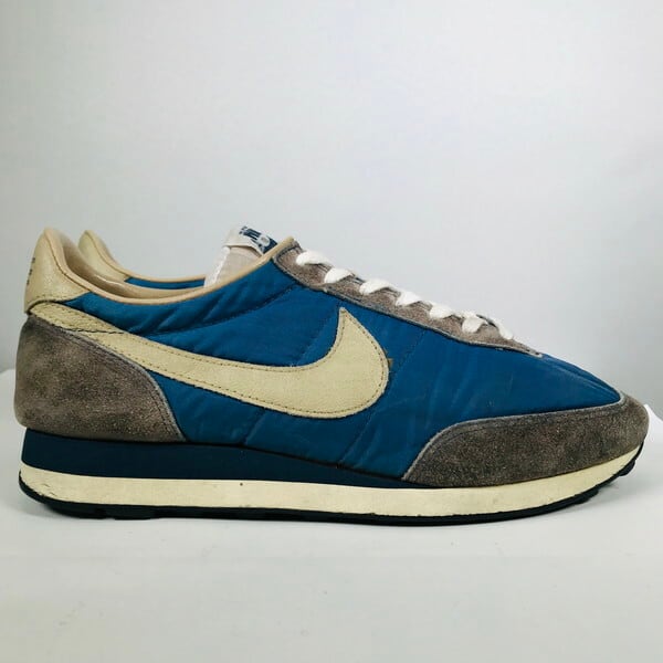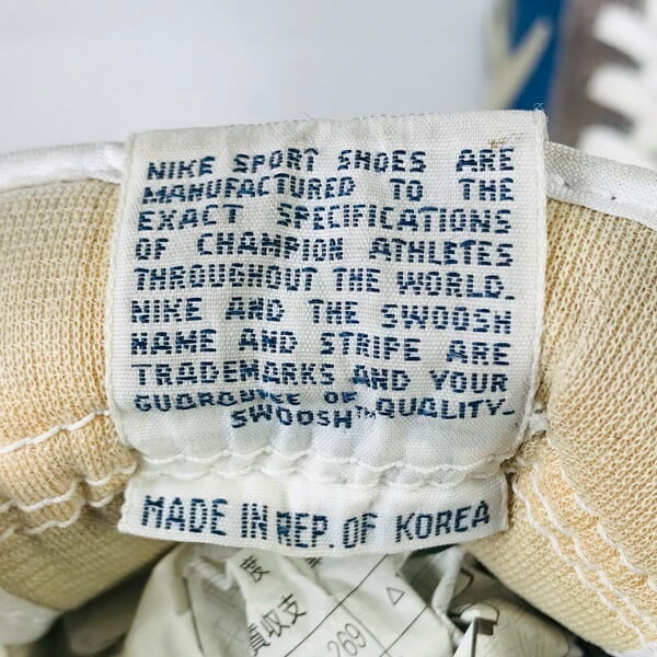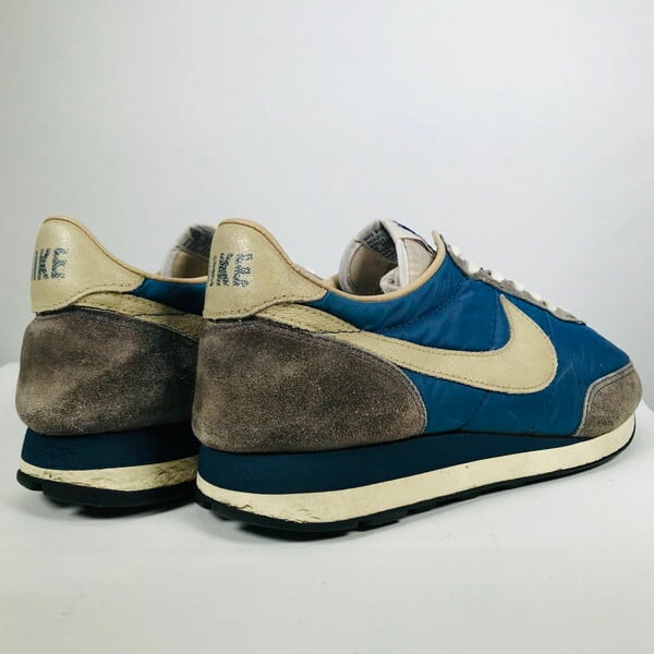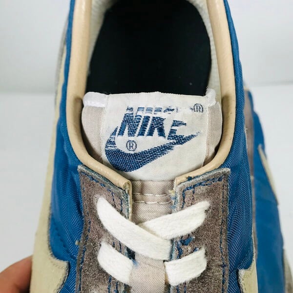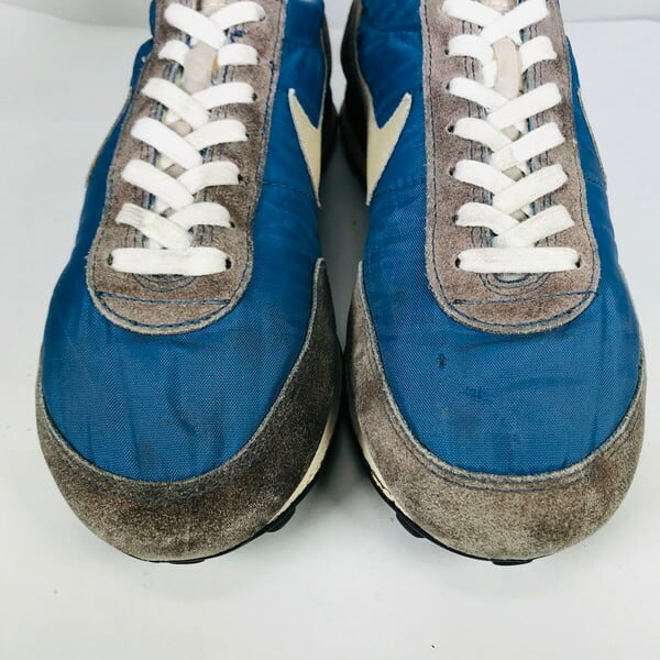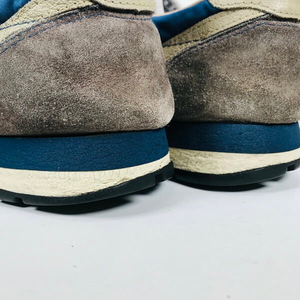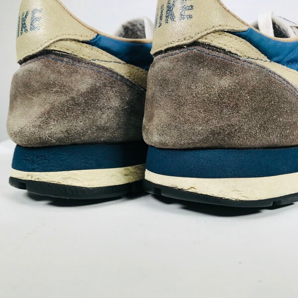 80年代のNIKE INTREPIDオリジナルです。整備された舗道や未整備の荒野でも安全に走れるクッション性を謳い、1週間に40km以上走るランナー向けに発売されたランニングシューズです。81年のKOREA製です。少しマイナーではありますが、ELITE等によく似たモデルで、シンプルなカラーリングでレトロ感溢れる1足です。アーチクッキーは硬化しほとんど欠損しています。ソールは硬化はございませんが、スポンジ部分に若干劣化が見られます。左足アッパーに小穴ございます。サイズはUS7.5。同モデルのメンズサイズもございますので、ペアでそろえてみても良いかもしれません。※あくまで古いアイテムですので、観賞用にお買い求めください。【全高】11cm【ソール】3cm【アウトソール】27cm