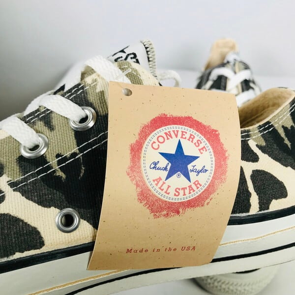 90年代のコンバースオールスターハイです。1997年に登場したこちらは2色展開の一つのURBAN CHARCOAL CAMOUFLAGEです。柄も小ぶりな迷彩で涼し気な印象です。希少な箱付きデッドストックです。2000年代初頭にUSAコンバースが倒産し、以降USA製コンバースは年々価格も高騰しております。この機会に是非希少なUSA製コンバースはいかがでしょうか。US8