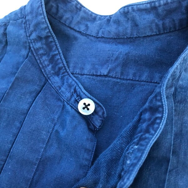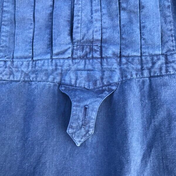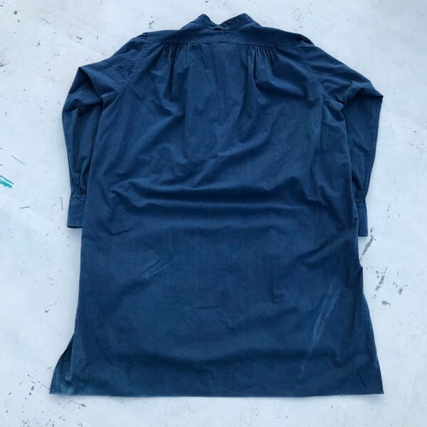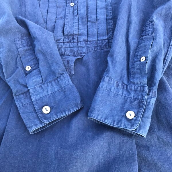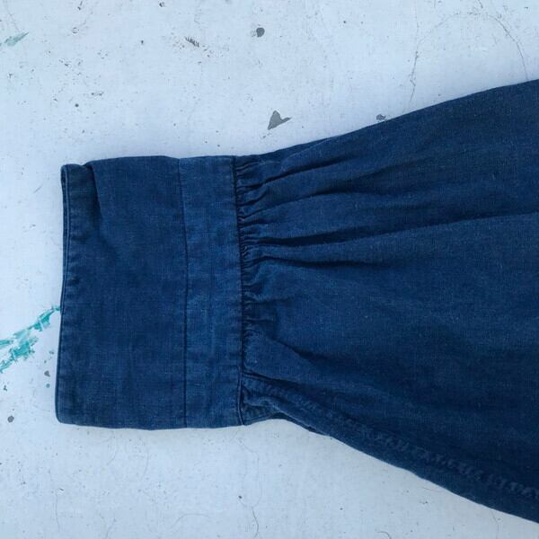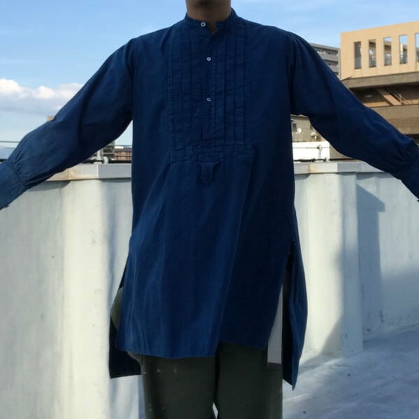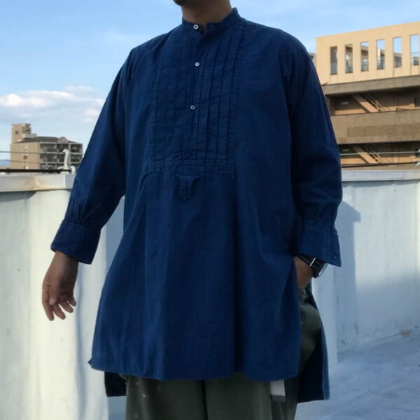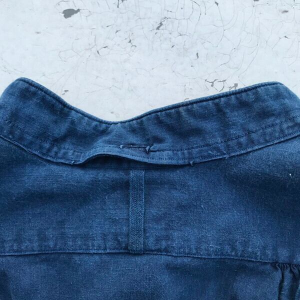 1920年代以前の物と思われるUNKNOWN インディゴリネンスモックです。フロントは古い年代にも良く見られる飾りプリーツがあり、スタンドカラーとなります。ボタンは全てシェルボタンが使用されていますが、元々は両面にボタンの付くカフスタイプを使用していた物を取り替えられた物だと思われます。程よく抜けたインディゴブルーでとても爽やかな色合いです。手首やヨーク部分の細やかなギャザー等当時のディティールも美しくステッチのピッチ幅も非常に細かく丁寧に縫製されています。裾に一部色抜け有り。男性のMサイズ程の身幅や着丈はございますが、170cm70kgのスタッフで肩幅と袖丈が少し小さめに感じます。女性からやせ型の男性にお勧めな1着です。
