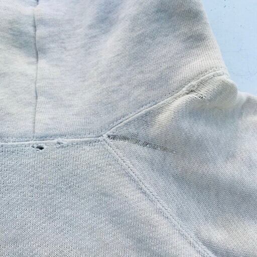 50年代頃のBRENTドラポケスウェットパーカーです。アメリカ3大ストアとして有名なMONTGOMERY WARDが展開するプライベートブランドです。無地のオートミールカラーにラグランスリーブ、裾リブから離されてとりつけられている通称ドラポケ仕様。全体にダメージと汚れ(黄ばみ?)がございます。特にフード縁と袖口、肩回りにダメージや生地の薄れが多く見られますので、補強またはリペアが必要と思われます。サイズは42~44のLサイズとヴィンテージスウェットにしてはなかなか大き目なサイズですので、お探しだった方にはおススメな1着です。