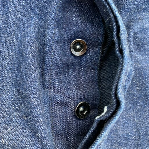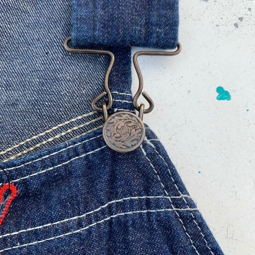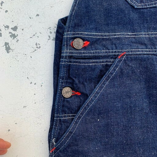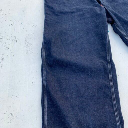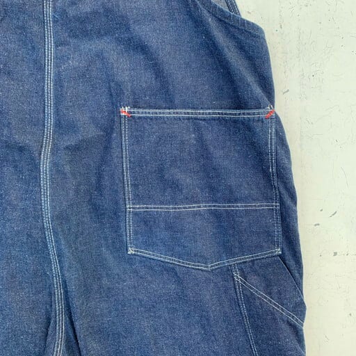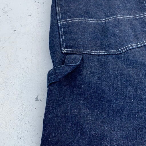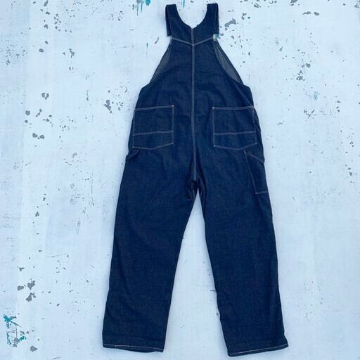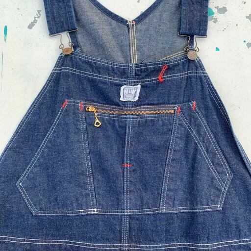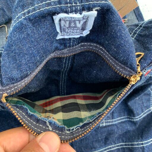 40年代から50年代頃のデニムオーバーオールです。N&W(ノーフォーク&ウェスタン)は1838年から1982年まで実在していた鉄道会社で、鉄道会社では珍しく1930~50年代頃まで自社でワークウェアを作った会社としてヴィンテージマニアの間で知られています。製造期間も短い事から現存数も非常に少なく、オリジナルはなかなか見かけないブランドです。こちらは非常に状態の良い1着で、ダメージ等の無い真っ紺のミントコンディションです。独特なポケットに7連のGRIPPERジッパー。ポケット内側にはチェックの当て布が施されています。フライボタンは黒ラッカー仕様ですので、40年代から50年代あたりに製造された物と思われます。今後なかなか見る事が出来ない極上のコンディションですので、お探しだった方は必見です。W45位。