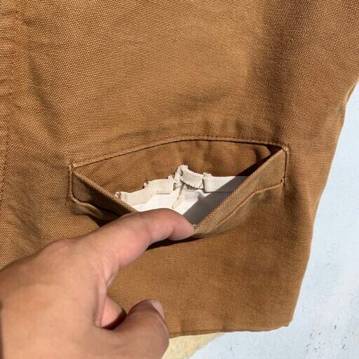 70年代頃のCarharttブラウンダックワークベストです。現行と違いプリントのタグが使用されています。表は色味もまだ濃いブラウンダック、裏地はあくりるの総ボア仕様です。ジッパーはブラスのYKK.ハンドポケット内にはユニオンチケットが付き、両ポケットと共にゴムでホルダーが取り付けられています。使用感はございますが、美品です。これからの季節のレイヤードスタイルに使えるアイテムですので、おススメです。