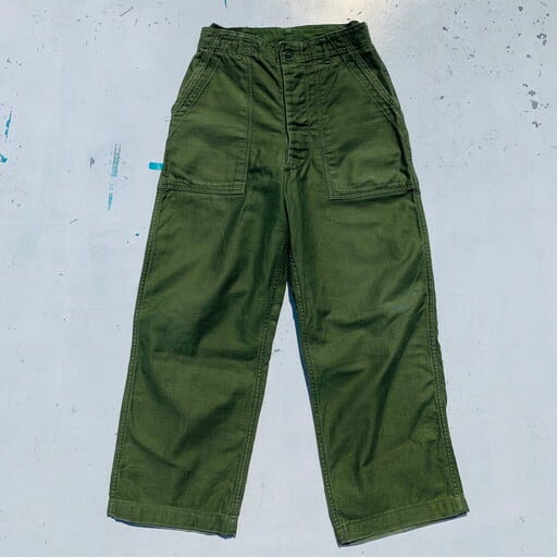 60年代のU.S.ARMYコットンサテンベイカーパンツです。DSA-1-151-C-62。1965年前後で省略されるサイドアジャスターが付属する比較的初期のタイプです。サイズ表記はSMALLでW30位です。左裾に少しだけダメージがございますが、その他は比較的ダメージも無く美品です。ベイカーパンツも初期の物は価格も高騰し始めていますので、サイズが合う方は是非いかがでしょうか。女性にもおススメな1本です。
