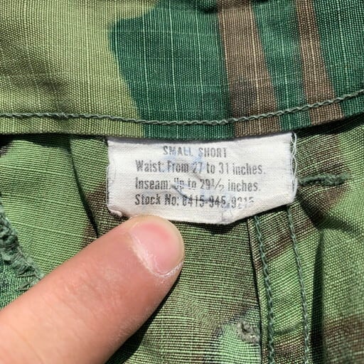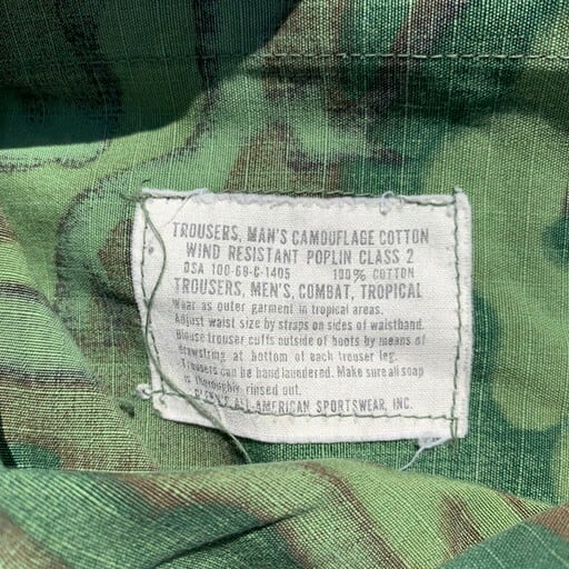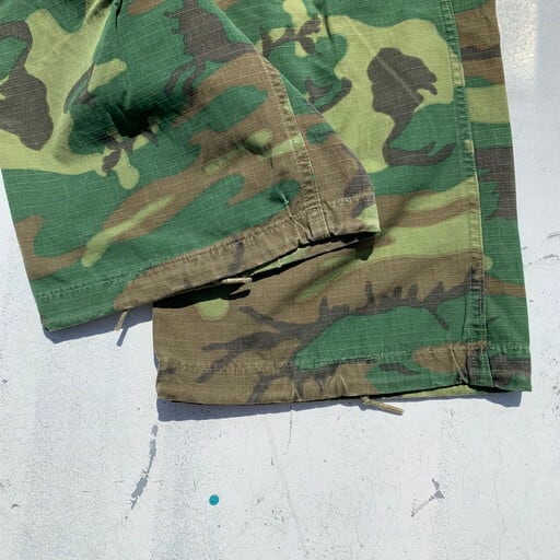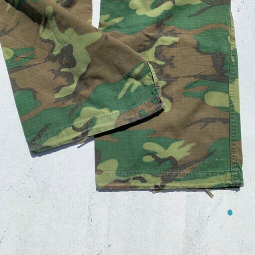 60年代のU.S.ARMYジャングルファティーグパンツです。ERDLグリーンリーフのリップストップ地となります。ウッドランド迷彩の元となった事で知られ、グリーン、ブラウン、ライム、ブラックで形成された通称グリーンリーフと呼ばれる比較的初期頃のタイプです。ボタンは42TALON。右ポケットフラップにダメージ、右ひざに擦れ、背面に3mm程の小穴が有ります。使用感はございますが、まだまだお使いいただけます。