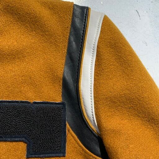 マスタードカラーにネイビーのワッペンが目を惹く1着です。肩ラインはレザーで切り替えがしてあります。背面に一部ウールが薄くなっているかしょがございますが、このためだつ汚れやダメージはございません。着丈もしっかりとある良いサイズ感ですので、おススメです。