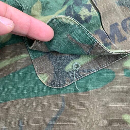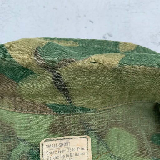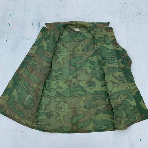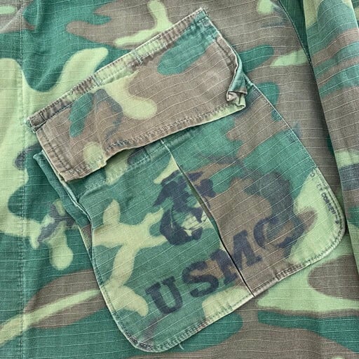 60年代から70年代頃のUSMCジャングルファティーグジャケットです。ERDLグリーンリーフのリップストップ地となり4thモデルです。ウッドランド迷彩の元となった事で知られ、グリーン、ブラウン、ライム、ブラックで形成された通称グリーンリーフと呼ばれる比較的初期頃のタイプです。胸元にはUSMCのステンシルが入ります。襟元に若干のスレはございますが、その他特筆するダメージはございません。程よく使用感がございますので、ヴィンテージボトムとの相性も抜群です。ジャングルファティーグジャケットは最近価格も上がりつつあるので、お探しだった方は是非いかがでしょうか。