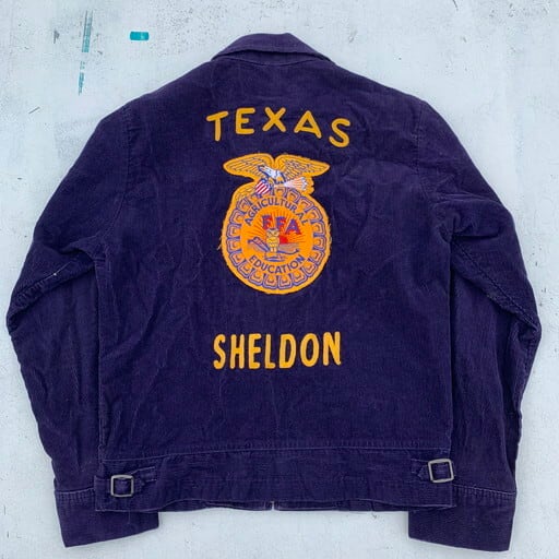90年代のFFAジャケットです。古着屋でも定番のこちらは、Future Farmars of Americaという1925年にバージニア州で設立されたアメリカ国立農業学校のユニフォームです。デザインもほとんど変わる事なく現在も使用されています。胸元にワッペン、背面にはチェーンステッチと大きなワッペンというかなり贅沢な仕様で古着好きの中でも人気があるアイテムです。色褪せは無くパープル寄りのネイビーで、経年変化も楽しめそうな1着です。サイズは36ですので、女性が着やすいサイズ感です。