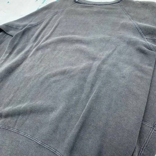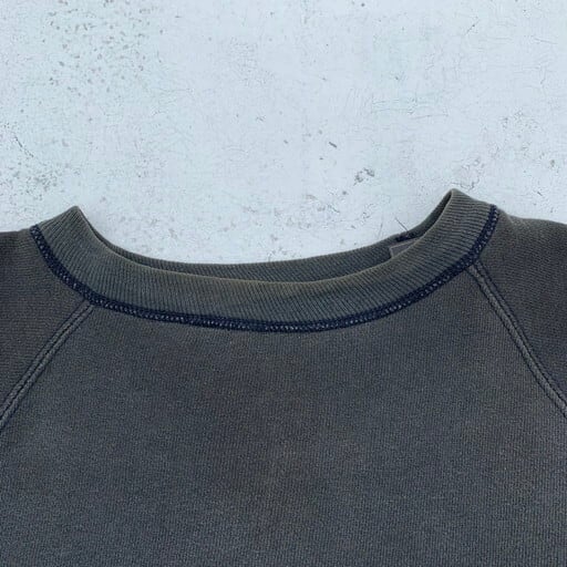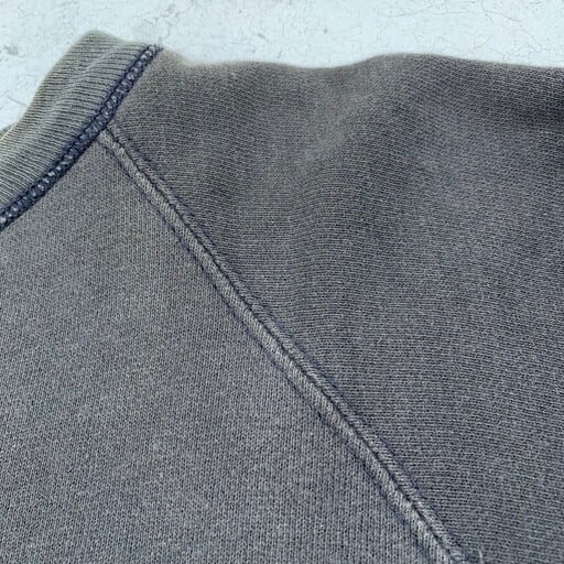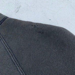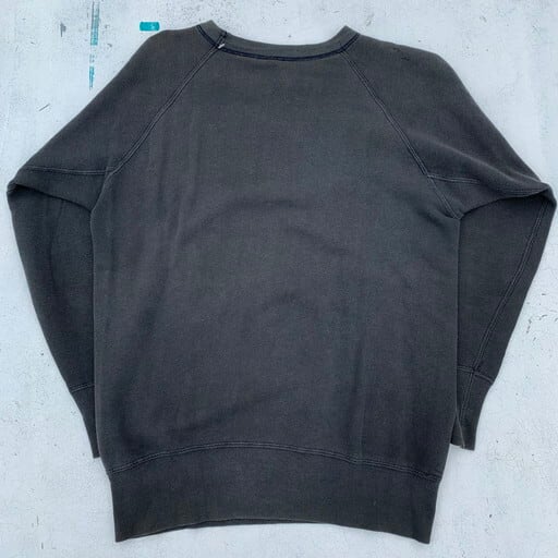 50年代から60年代頃のラグランスリーブスウェットです。タグ無しの為メーカー不明。無地の墨黒ボディは以外と見かけないと思います。ラグランに脇ガゼット。右肩後ろに小さなダメージがございますが、その他は比較的状態良好です。サイズも珍しく着丈もしっかりとある大き目サイズですので、希少です。