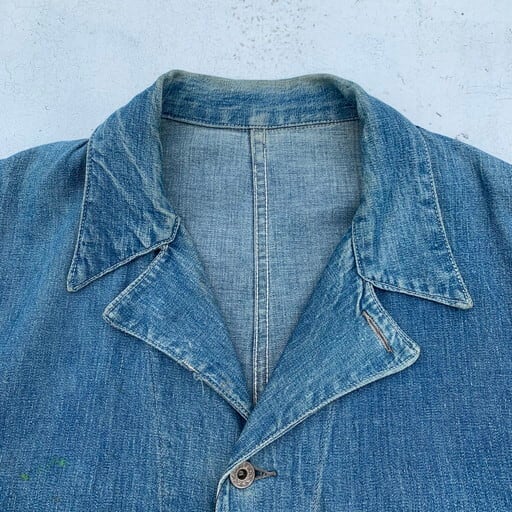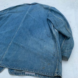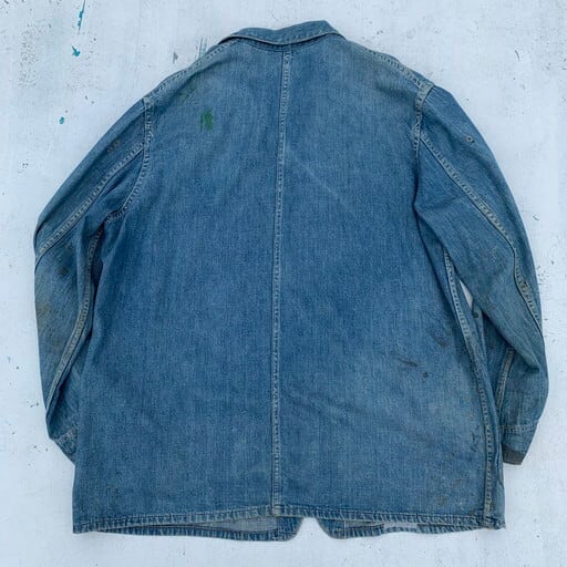 40年代のHERCULESデニムカバーオールです。フロント下月桂樹4つボタン、2ポケット、ハンマータグ、ダブルステッチ。第二次世界大戦の物資統制時に作られた物と思われる1着。ヘラクレスの中でも人気のハンマータグ。近年ハンマータグが付く個体もなかなか見かけなくなり、これからはさらに枯渇するであろう非常に希少な1着です。全体にフェードしており、所々に小さなダメージも見られます。右上に2箇所、フロント右ポケット下に1か所タタキがございます。グリーンのペンキがカンヌキと合っていて雰囲気抜群です。サイズはゆったりとしており、42~44位はあるのではないでしょうか。大き目サイズをお探しだった方は必見のスペシャルピースです。