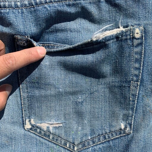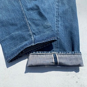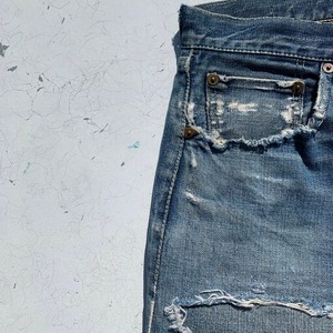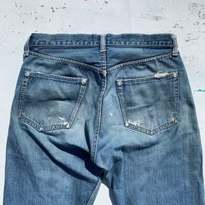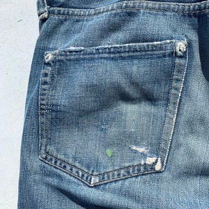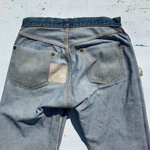 40年代から50年代初頭のLEVI'S501XX47-52モデルオリジナルデニムです。第二次世界大戦の物資統制が解除され、各ディティールが復活したモデルです。トップ裏フラット、フライドーム状ポツポツ、Vステッチ、銅製リベット、隠しリベット、サイドステッチ長め、リベット刻印中央寄り、ウォッチポケット裏セルヴィッジ、アウトシームセルヴィッジ、革パッチ、赤タブ欠損、イエローステッチ、極太ベルトループ、センターセット。リベットの文字が中央に寄り、トップ裏フラットというディティールで、恐らく49~51年頃の過渡期に製造された物では無いでしょうか。ポケット縁や腿、バックポケットににダメージが有り、腿は裏からデニム生地と接着芯でリペアされています。トップボタン付け根も少しリペアされています。ウェストはW32~33とゴールデンサイズ。ダメージ有りの状態特価です。リペアを楽しんでいただける方お早目に。