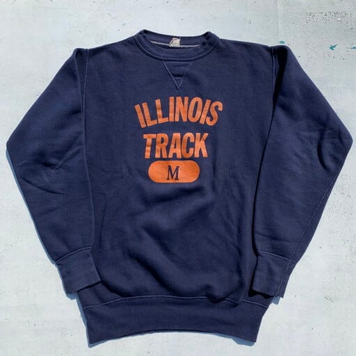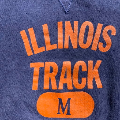 50's Russelle Southern ラッセル 前V 貼り付け セットインスリーブ スウェット ネイビー プリント3段 ILLINOIS TRACK 脇ガゼット 美品 M 大き目 USA製 希少 ヴィンテージ