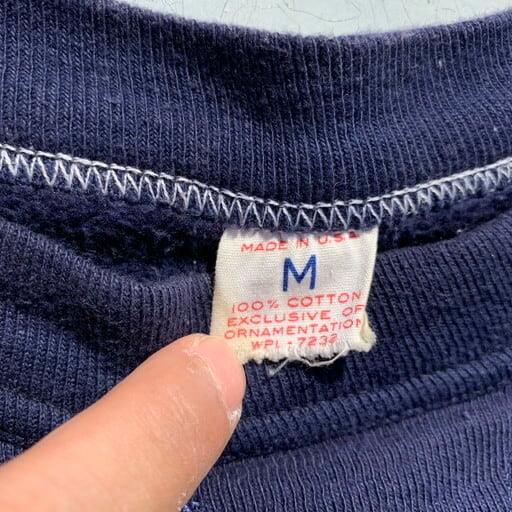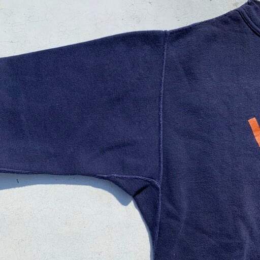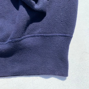 50年代頃の前Vスウェットです。タグに記載のWPLナンバーからRusselle Southern社の物と思われます。バインダーネック、貼り付け前V、4本針ステッチ、丸胴リブ長。人気のネイビーボディにオレンジのプリントが映える1着です。ラッセル特有の光沢のあるステッチが特徴的です。ダメージはございません。右わき腹後ろに目立たないですがシミがございます。ヴィンテージスウェットでここまでサイズが大きい物はなかなか出ません。Mサイズでも大き目です。