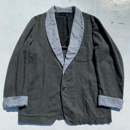 30年代頃のKaufmann'sウールスモーキングジャケットです。1871年にアメリカペンシルバニア州ピッツバーグで創業したデパートブランドです。薄手のウールにフランネル生地で切り替えが施されており、少しカジュアルな印象の1着です。ボタンはどちらも交換されている様です。背面に3mm程の穴が開いております。少しゆったり目ですので、カバーオール感覚で合わせてみてはいかがでしょうか。