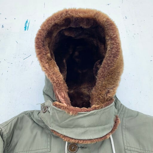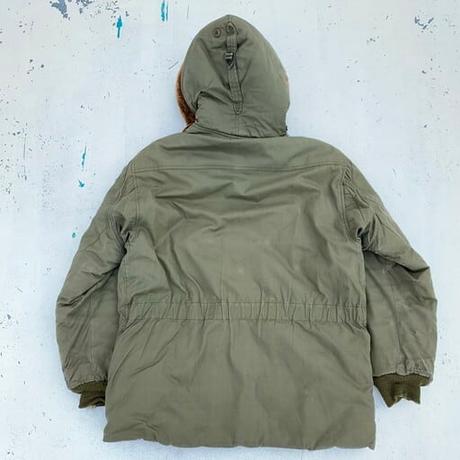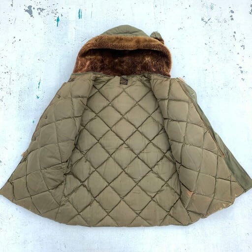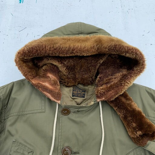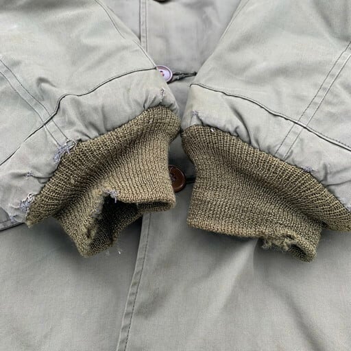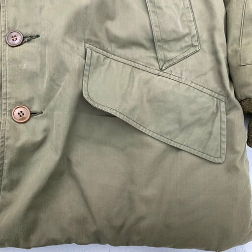 40年代のEDDIE BAUER USAAF B-9フライトジャケットです。1943年から1944年の極短期間のみ採用された希少なB-9。特にエディバウアー社製は中でも希少かつ人気のスペシャルピースとなっております。フライトジャケットでは珍しいダウンを使用しており、防寒性に非常に優れています。フードのムートンに一部抜けは見られ、袖口等にリペアも見られます。ジッパーエンドにダメージは御座いますが、開閉可能です。内側のライニングにも少しダメージはございますが、年代を考慮しても素晴らしいコンディションと言えます。サイズは36ですが、170cm70kgのスタッフでジャストサイズです。コレクタブルな1着ですのでお探しだった方は必見です。