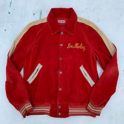 50's 60's Pla-Mor コーデュロイアワードジャケット De Molay デモレー フリーメイソン 秘密結社 スタジャン ボタスタ レッド ボーダーリブ スナップ M~L 希少 ヴィンテージ