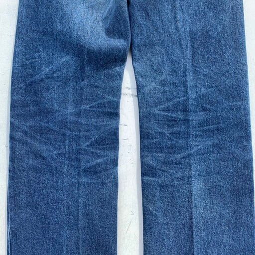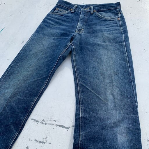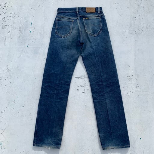 70年代から80年代頃のLee 200-0141デニムパンツです。101の後継バックポケット内側に当て布が無いモデルです。フロントは42TALON、ピスマークには®、MR入り。内側にユニオンチケット有り。この年代のLeeの個体ではあまり見ない良い色落ちをしており、フロントにはヒゲ、膝裏にはハチノスがうっすらと確認できます。裾にダメージが少しございます。スリムなストレートシルエットですので、女性でも合わせていただきやすいサイズ感です。W30。