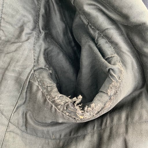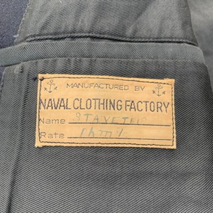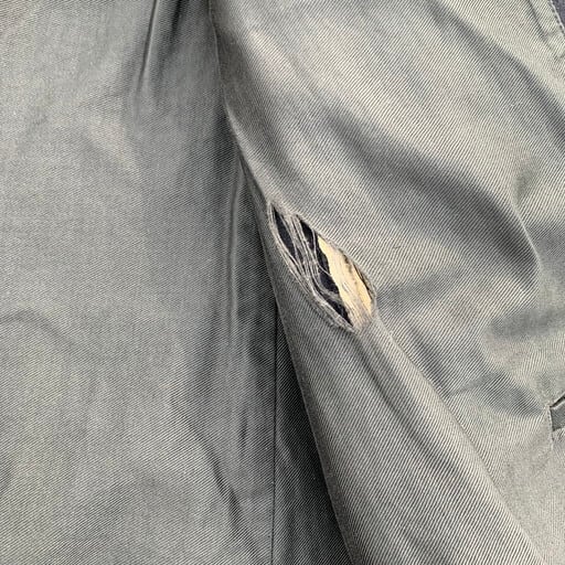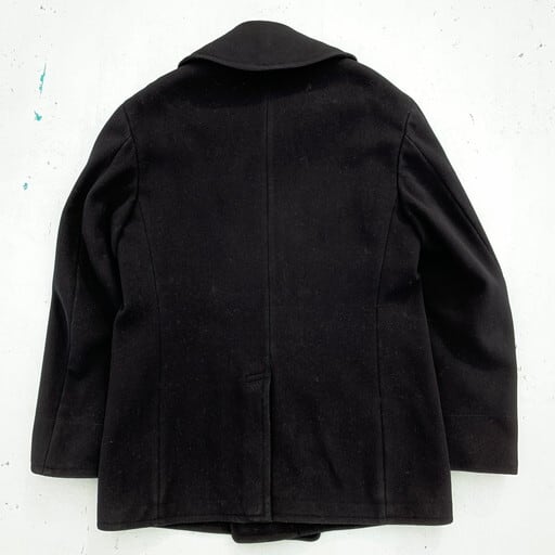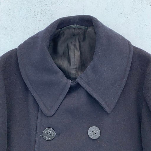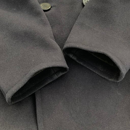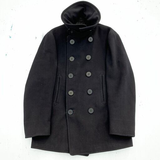 30年代から40年初頭のU.S.NAVY10ボタンPコートです。チンストラップ、コーデュロイ地ハンドウォーマーポケット、裏地コットン、刺繍タグ。幻と呼ばれる13スターボタンから移行したモデルで、4つポケから2ポケへと変更となっています。高密度ウールを採用しているためごわついていない表面です。裏地にはステンシルが施されております。脇のアームホール箇所に裏地が擦れて若干ダメージがございます。年代的に見ても状態も良く虫食い等も見られません。サイズは38~40位170cm70kgでスウェットを着て丁度良いサイズ感です。希少なグッドコンディションの10ボタンPコートですので、サイズの合う方、お探しだった方必見です。