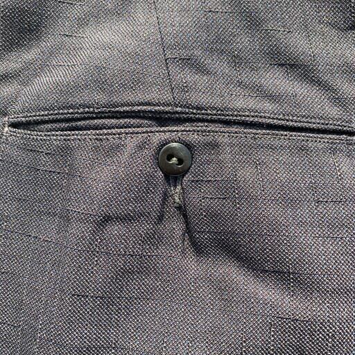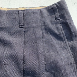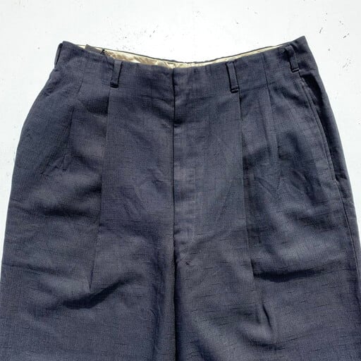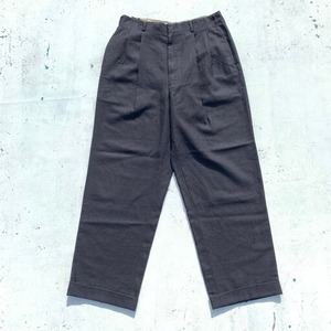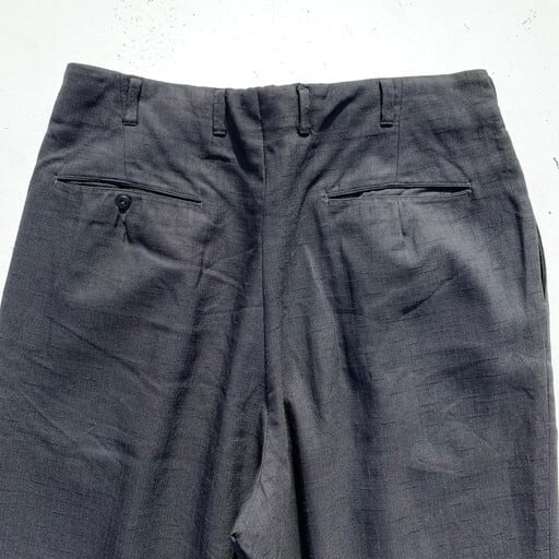50年代から60年代頃のOLDタックスラックスです。凹凸のある絣柄が特徴的なスラックスです。フロントはアルミTALONジッパーを使用。ウエスト内側には恐らくサスペンダー用のベークライトと思われるボタンが付いていますが、2か所割れています。ボディはブラックですが、細かなブルーの下糸がドット状に見える事で全体がネイビーのように見えます。股付近と左脛、左裾に虫食いのようなピンホールが見られますがリペアは比較的安易にできそうです。ワずどんとしたクラシックなシルエットで、ルードなスタイルにお勧めな男臭い1本です。