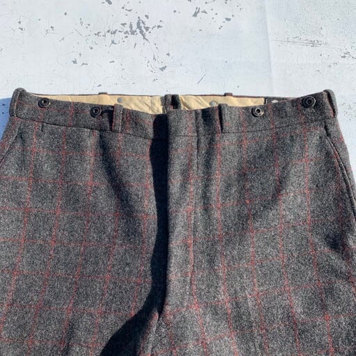 50年代ころのWoolrich ウールパンツです。正式名称はMalone Wool Trousers。肉厚なへヴィーウールを使用しており、保温しも高い1本です。グレーにレッドとグリーンのチェックが大人な雰囲気です。タグは古いタイプで、40年代のREG表記から50年代になり変更となった®となります。フロントはTALONジッパー、ウエストにはサスペンダーボタンが付属します。ウエストはW40と大きめですので、ベルトで絞って穿いても良いですが、サスペンダーで合わせていただいてもおしゃれです。裾のパイピングに若干のダメージはございますが、その他は良好です。この年代で、ここまでゆったりしているサイズのMalone Wool Trousersはあまり出ないと思いますので、この機会に是非いかがでしょうか?
