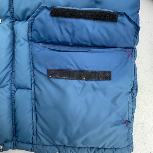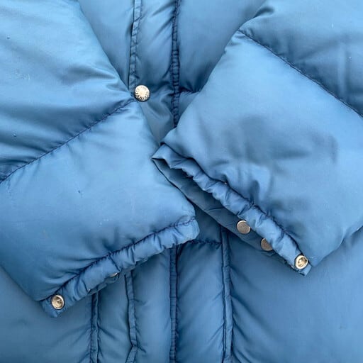70年代頃のTHE NORTH FACE ダウンジャケットです。タグは欠損していますが、初期の茶タグが付くモデルです。当時はフードが別売りだった為欠損しているわけではございません。全体に使用感があり、肩から袖にかけて日焼けがみられますが、ヴィンテージらしい雰囲気がGOODな1着です。右袖に擦れや小さなピンホール、左袖に3mm程のダメージがみられます。ダウン抜けは無くパンパンに詰まっていますので、保温性は高いです。サイズ兵機はございませんが170cm70kgで丁度良いサイズ。恐らくUSA企画のSサイズ相当と思われます。軽くて保温性も高いので、冬に重宝するアイテムです。