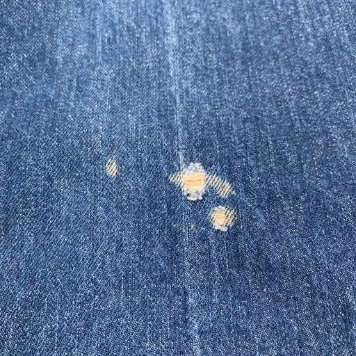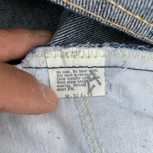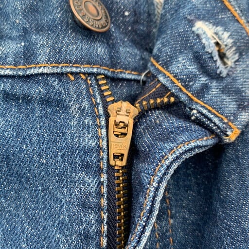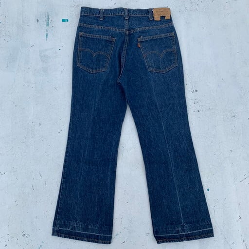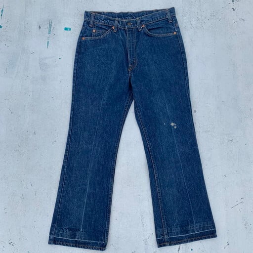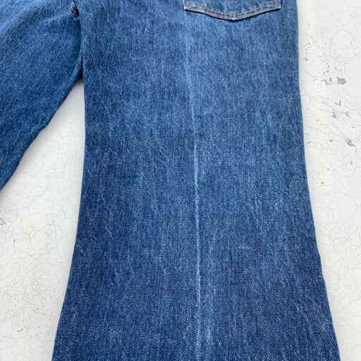 80年代のLevi's20517-0127ブーツカットデニムです。80年製のリーバイスは一部ではハチマルと呼ばれ、コアなリーバイスファンに人気のある商品です。オレンジタブが付き、501等でいえば66後期から赤耳へと変わる過渡期のモデルと同年代です。スタプレのように穿いていたのかセンタープレスの跡が見られます。左膝に小さな色抜けとダメージがございます。色残りも5割弱ございますので、気軽にガンガン穿ける1本です。