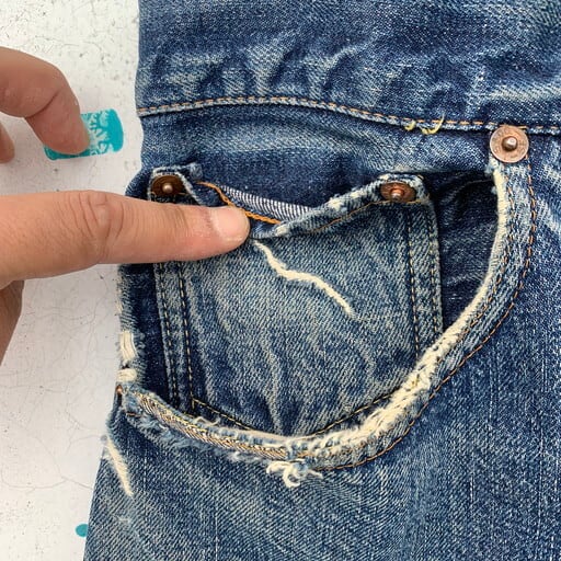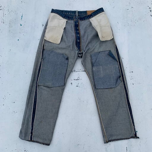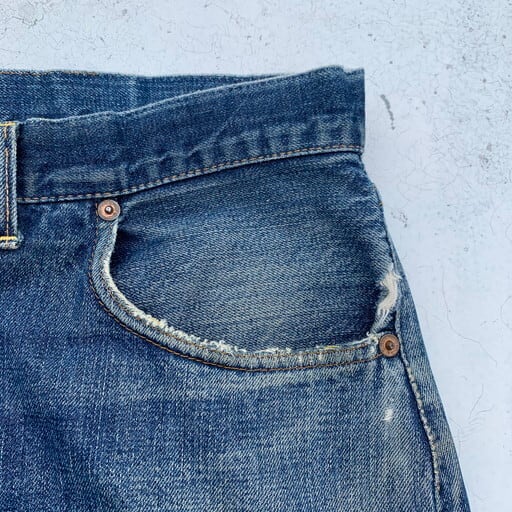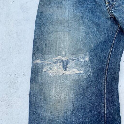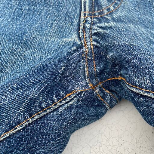 70年代頃のLevi's501デニム、66前期モデルです。トップボタン裏刻印6、ウォッチポケット裏チェーン、バックポケット裏シングル。赤タブ欠損。濃淡のある色落ちで、66前期の特徴でもある縦落ちが確認されます。両膝のリペアも非常にアジのある表情で男心をくすぐります。紙パッチの表記はW42ですが、ウエストからヒップのリサイズが施されており、ウエスト実寸はW36となります。66と言えばテーパードが利いた比較的スリムなシルエットですが、大戦モデルを彷彿とさせるズドンと太いシルエットに変貌しています。上手にリサイズされているので違和感はございません。裾にダメージや所々にリペアがございますが、そのリペアも相まって非常に雰囲気の良い1本です。ワークウェアらしいゆったりなシルエットが好みの方に是非お勧めしたい501です。