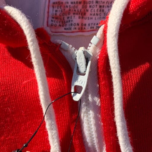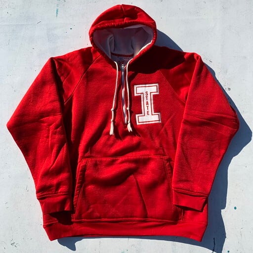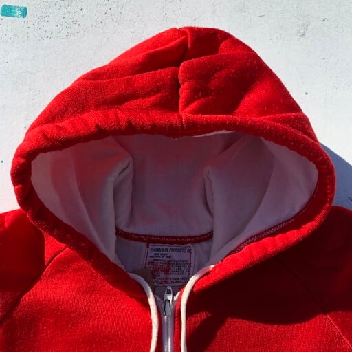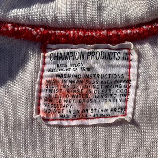 60年代後半から70年代初頭頃のChampionハーフジップパーカーです。CHAMPION KNITWEARから表記が変わった跡のタタキタグが付きます。ナイロン100%で、ダブルフェイスのような作りをしています。ジッパーはブラスでは無くプラスチックのレールの42TALONが使用されていますので、こちらのタタキタグの中では後期に当たると思われます。胸元にはナイロンのレタードワッペンが縫い付けられており、恐らくインディアナ州の学校のワッペンでは無いでしょうか。全体にうっすらと毛羽立ちがございますが、汚れ等は無く綺麗です。サイズはL位でゆったりとしています。リバースとは違った雰囲気ですので、変化球な1着としていかがでしょうか。