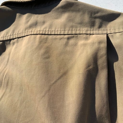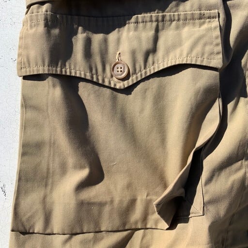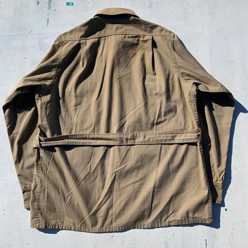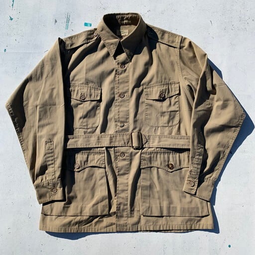60年代頃のL.L.BEAN名作サファリジャケットです。19世紀末にヨーロッパからの開拓民であるアングロアフリカンにより普及したとされるサファリジャケットは大きな機能的なポケットがあるので、カメラマンに重宝されたとされ、近年のカメラマンジャケットの元になったと思われます。薄手のコットン素材でしっかりと張りがありアウトドアスタイルでありながらどこか上品な印象です。王侯貴族の道楽として探検で愛用されていたのも頷けるデザインです。襟元にはTM表記の無い筆記体タグ、ボタン、ベルトは完品です。所々に若干の薄汚れはございますが、ダメージ等無く綺麗です。サイズは38。身幅がかなりゆったりしています。ゴールデンサイズでコンディションの良い物はなかなか見つからないと思いますので、是非いかがでしょうか。