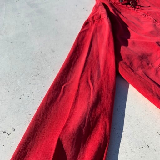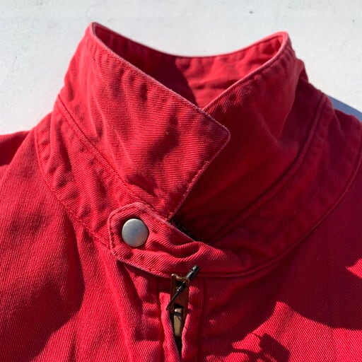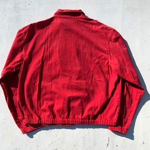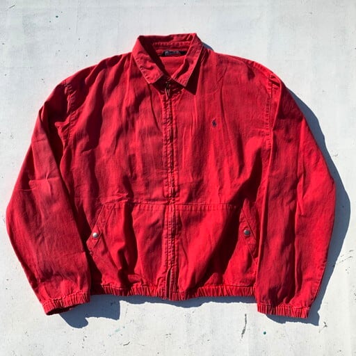 80年代から90年ぢ頃の物と思われるポロラルフローレンのコットンスウィングトップです。チンストラップが付くタイプで、希少なUSA製モデルです。胸元には定番のポロ刺繍が入ります。程よくフェードしたレッドが良い雰囲気です。腕などにヤケ、背面に薄汚れ有り。サイズはL表記ですがXL位は有りそうです。USA製もなかなか出なくなりましたので、お好きな方は必見です。