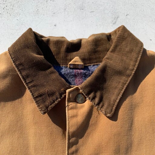 70年代頃のCarharttブラウンダックミシガンコートです。カーハートの代表的なワークウェアとして人気のカバーオールタイプです。襟裏にフードを留めるスナップボタンがございますが、恐らく当時も別オプションで販売されていたと思われます。現行モデルと違いタグはプリントタグ。表記50のビッグサイズで身幅は大きいですが着丈は長くなくざっくりと着やすいサイズ感です。胸ポケット上にハンドペイントで名前が書かれており、襟裏も同様にネームが書かれています。右袖に1cm台の穴が有り、袖口にスレダメージがございます。その他薄汚れはあるものの、色褪せも少なくワークウェアとしては状態は良好です。なかなか出ないビッグサイズですので、お探しだった方はいかがでしょうか。