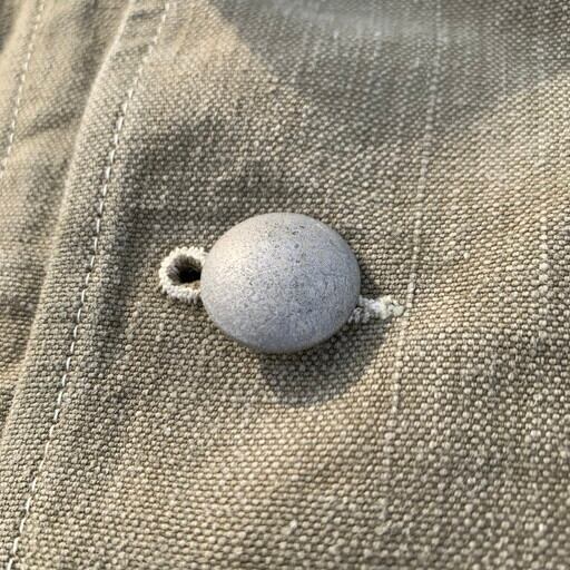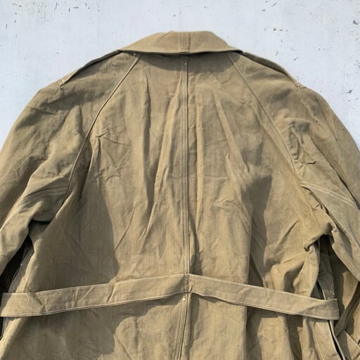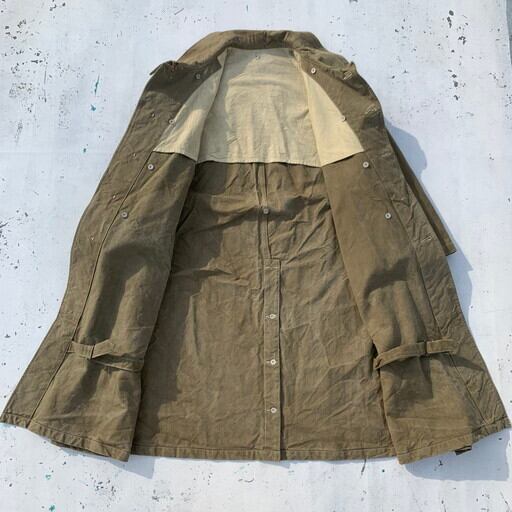 40年代から50年代頃のフランス軍モーターサイクルコートです。使用感の少ないミントコンディションです。裾の広がったAラインのシルエットがとても綺麗な1着です。大き目の襟裏にはチンストラップが付属し、ウエストにはストラップベルト、バックの裾はボタンで開閉できるようになっております。オーバーコートの為、ポケットは貫通式となっており、コートを脱がずに内側の物を取り出せます。内側にはバイク乗車時に裾をばたつかせない為のストラップもございます。今回のこちらはサイズ2。全体に使用感はございますが、ダック地特有の凹凸あるアタリがヴィンテージらしさを醸し出しています。非常に人気の高いアイテムですので、お探しの方は是非いかがでしょうか。