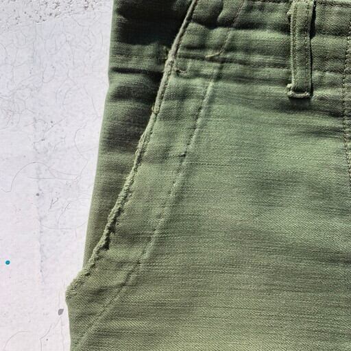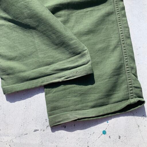 50年代後半から60年代初頭頃のU.S.ARMYベイカーパンツです。内タグが欠損している為コントラクトなど不明。サイドにアジャストボタンが付きます。尿素ボタンは色味が少し濃いタイプです。右フロントポケットと、左ひざにダメージ有ります。バックのお汁部分にタタキがございます。使用感はございますが、このドカンシルエットタイプの古いベイカーパンツも少なくなってきていますので、サイズの合う方は是非いかがでしょうか。