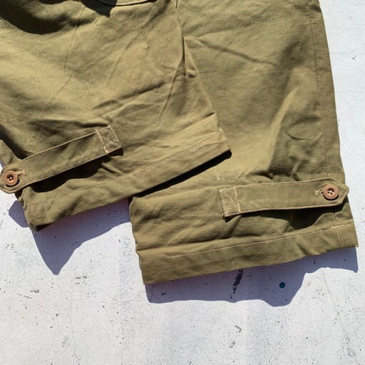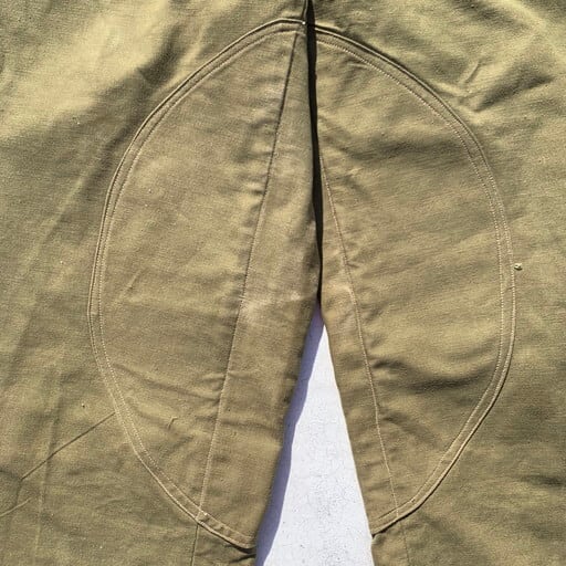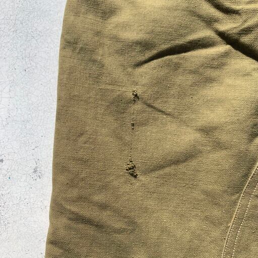 40年代から50年代頃のフレンチアーミーM-38モーターサイクルパンツです。厚手でしっかりとしたコットンリネン素材です。M-38モーターサイクルコート(Pコートのようにボタンが配置されているタイプ)と上下で着用するモデルです。フロントはバイク乗車時の防風対策としてエプロン仕様となっております。基本オーバーパンツでゆったりとしているので、ベルトループの無い代わりに縫い付けられているウエストベルトを締め上げて着用します。サイドのポケットは貫通式となっています。こちらのタイプはステッチがベージュで、ボディも若干明るめなあまり見かけない個体です。木製ボタンが良いアクセントとなっています。ひざ内側の当て布付近に色抜けが見られます。多少使用感はございますが、特筆するダメージは無く良好です。前掛けタイプはあまり出ないと思われますので、ユーロミリタリーファン必見です。