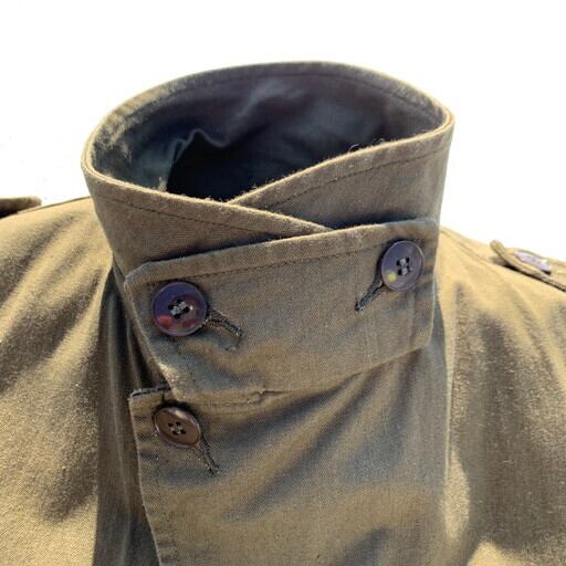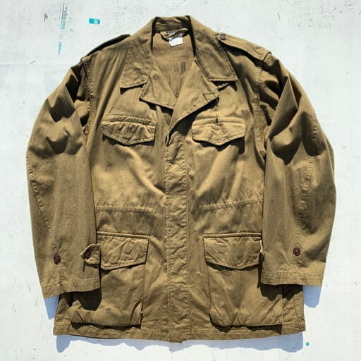 50年代~60年代頃の物と思われるフランス軍M-47フィールドジャケットです。米軍のM-65に相当するこちらはヘリンボーンツイルを使用した後期モデルとされています。黄土色に近いオリーブカラーで、M-65に比べ生地感は軽くカバーオールのような感覚で羽織れます。ウエストが内側のドローコードで調整できます。US物に比べシルエットもスタイリッシュで、野暮ったくなく大人なコーディネートにも使いやすい1着です。状態はダメージ等も無く非常に状態の良いので、大変お勧めです。