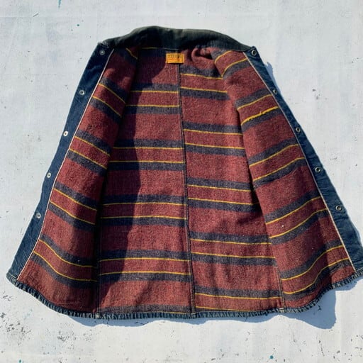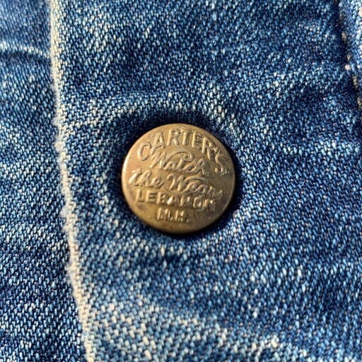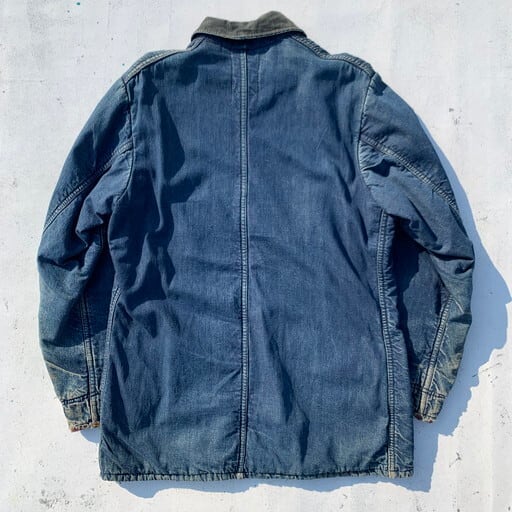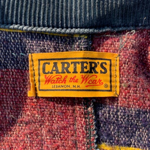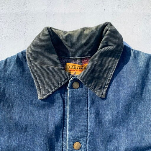 50年代から60年代頃のCARTER'Sブランケットライナーデニムカバーオールです。1859年に創業した老舗ブランドです。コーデュロイ襟に社名入りのスナップボタン。右ハンドポケットにユニオンチケットと思われる布が見られます。袖口にダメージがあります。カバーオールでは珍しく袖内側にリブが付くモデルです。フロントボタン裏には耳付き仕様です。ブランケットライナーにはダメージは見られません。カーターズのカバーオールは他のワークウェアブランドの物に比べ身幅が細くシャープな印象ですので、細身の方におすすめなアイテムです。