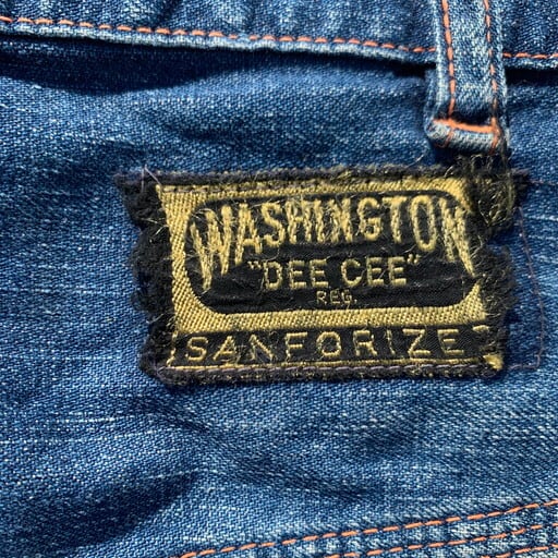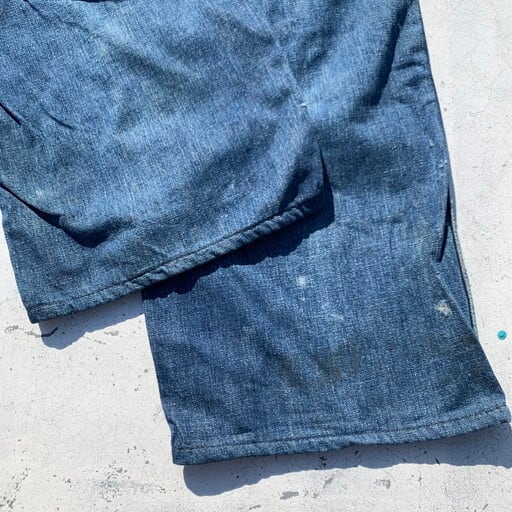 60年代頃のWASHINGTON DEE CEEデニムペインターパンツです。テネシー州ナッシュビルにあったとされるワシントンマニュファクチュアリングカンパニーが所有していた老舗ワークブランドです。フロントトップのスナップボタンはストアブランド等でも見られる三角モチーフボタンにPRENTICEの片爪ジッパーが採用されています。ポケット縁は鉄製リベットで補強されています。両ポケットを始め所々にリペアがあり、両脛下に細かなダメージが見られます。