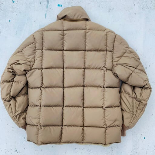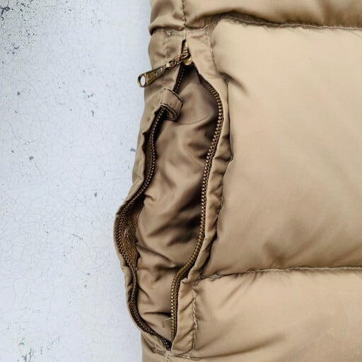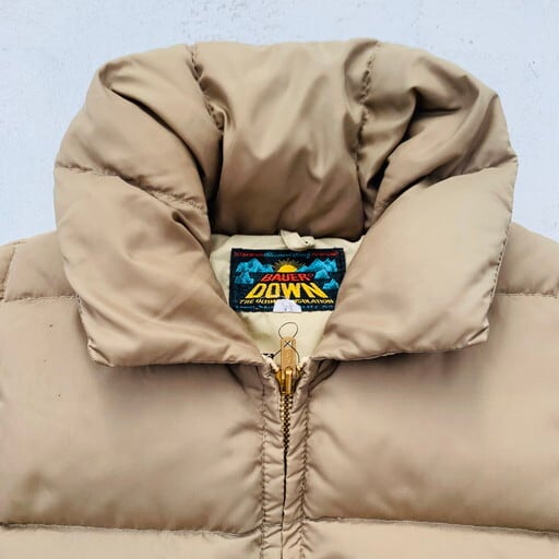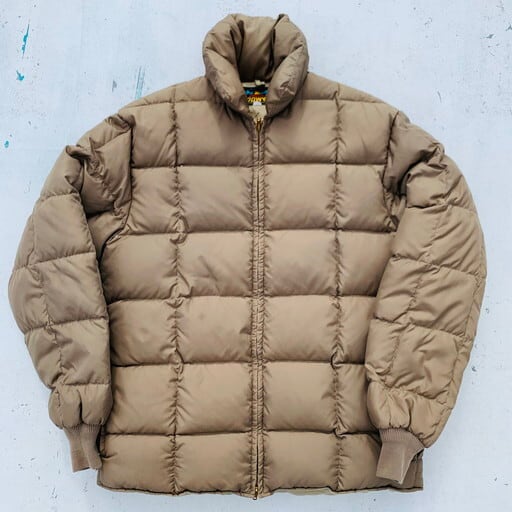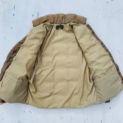 60年代頃のエディーバウアージップアップダウンジャケットです。日の出タグが付くこちらは当時のオリジナルで、YUKONジャケットのような格子状にキルティングされたシンプルなデザインです。襟裏にナイロンのフードが収納されていて、ハンドウォーマーポケットは涙TALONジッパーで開閉できるように設計されています。袖リブに一部色抜けや、所々に薄いシミが見られますがボディーカラーと相まって目立ちにくくなっています。サイズはLサイズ。ダウンの抜け等もほとんど無く防寒性も十分です。是非お勧めな1着です。