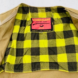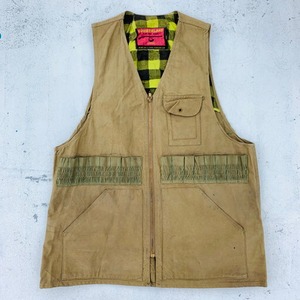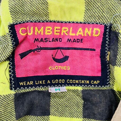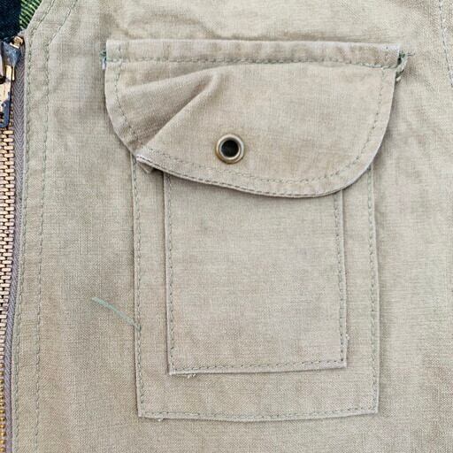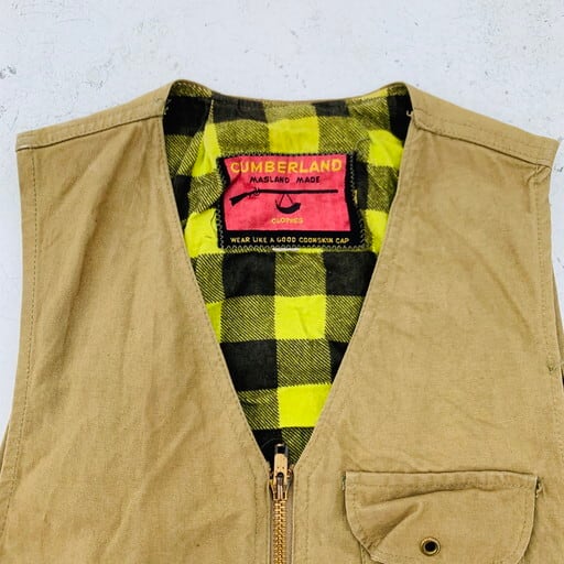 60年代頃のCUMBERLANDハンティングベストです。ハンティングウェアやフィッシングウェアのブランドですが詳細は不明。ハンティング、フィッシングの名門MASLANDが製造を手掛けたOEM物です。MASLAND以外には1903年創業のTapatco(The American Pad&Textile Co。主に馬のカラーパッド等手掛けていたメーカー)が手掛けた物も存在し、このMASLANDとTapatcoもまたタッグを組んで製造をしていた事もあるようです。オリーブがかったダック地を使用しており、MASLANDの製品に見られるような角ばったポケット等が特徴的です。首元の黄緑色のバッファローチェックも興味深いディティールです。背面にはゲームポケットも完備。全体にくすみやシミ等の使用感がございます。着丈もしっかりとあるので合わせやすい1着です。