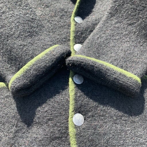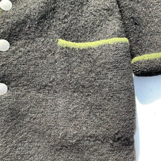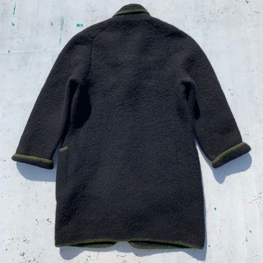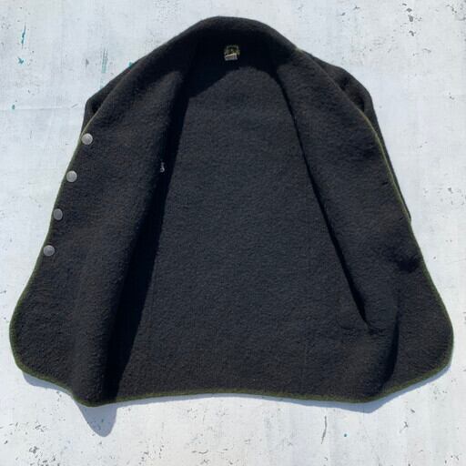 80年代頃のHOFERチロリアンジャケットです。オーストリアチロル地方等に伝わる民族衣装として知られており、このHOFERはその中でも有名なメーカーです。大きなサイズでジャケットを形成した後、高温のスチームで圧縮させる製法で作られてており、独特な丸みが特徴的です。コインボタンは鼓釦(拝みボタン)となっており前立て左右にボタンホールがございますので、左右どちらでも合わせる事が出来ます。虫食い等も無く状態は綺麗です。170cm70kgで、スウェットの上から着用して少しゆとりのあるサイズ感です。今はこのブランドは廃業してしまったようで、古いオリジナルは希少と言えます。ブラックとグリーンの落ち着いたカラーリングですので、とても合わせやすい1着です。