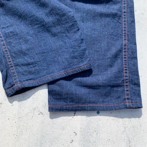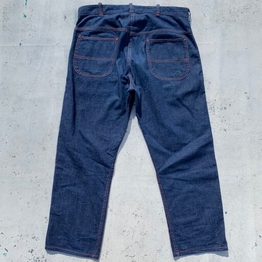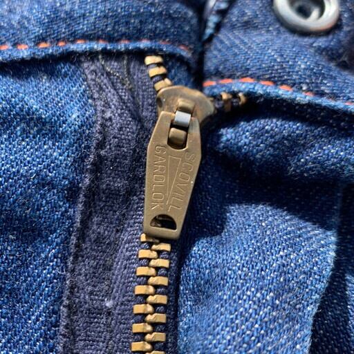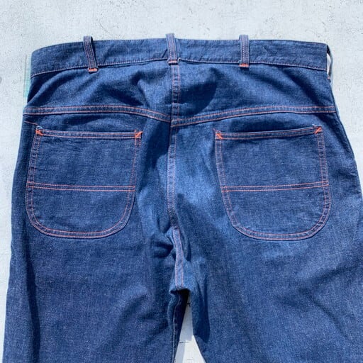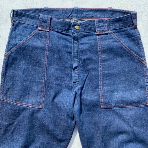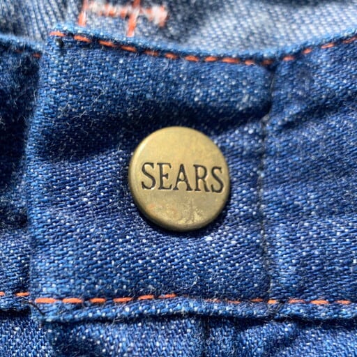 60年代頃のSEARSデニムパンツです。恐らくですが70年代以降になるとトップボタンSEARSの文字の周りに装飾が入ると思われます。フロントSCOVILのセミオートマチック。バックポケットにはユニオンチケットが縫い付けられています。注目すべきは、フロントのベイカーパンツの様なパッチポケット。サイドにハンマーループやツールポケットは付かない仕様で、テーパードの利いた独特なシルエットです。色味も濃くダメージやスレ等も見られないミントコンディションです。W38と大き目ですが、野暮ったくなく合わせていただける1本です。