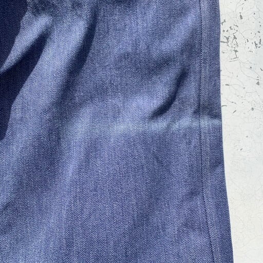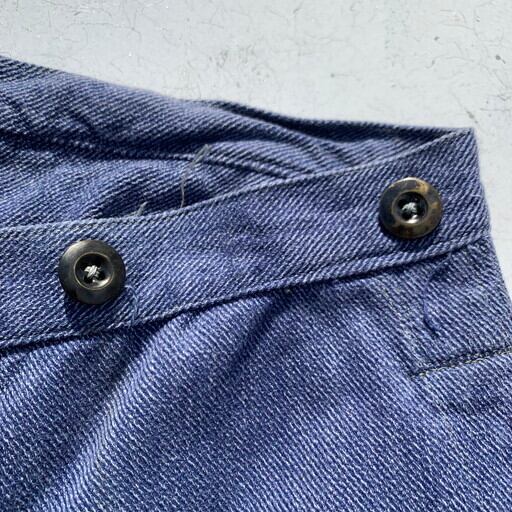 40年代から50年代頃のスイス軍デニムオーバーパンツです。メタルボタンに、針刺しシンチバックが付属しています。厚手のデニム生地を使用しており、サイドのポケットは貫通式となっています。裾はボタンで開閉や1段階絞る事が出来ます。センタープレス跡と、右ひざ裏にヤケがございますが、ダメージ等は特にございません。色味は爽やかなライトブルーですので、春から夏にお勧めな1本です。ウエストはW36程度。サスペンダーでシャツをインして合わせてみてはいかがでしょうか。