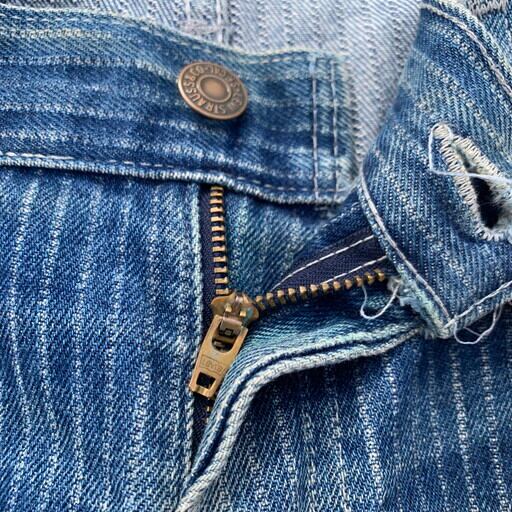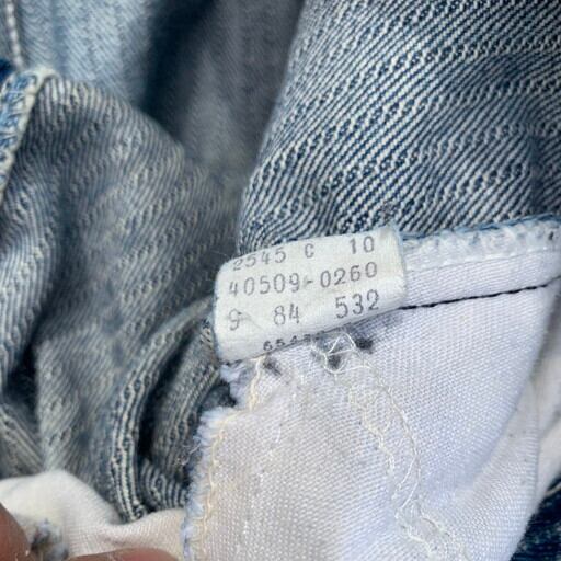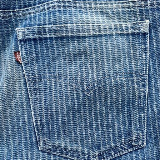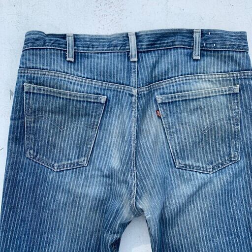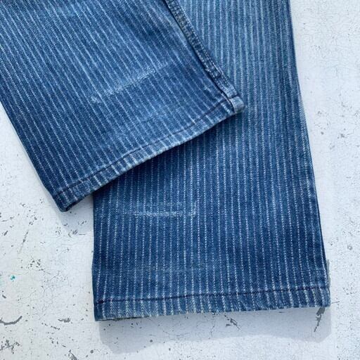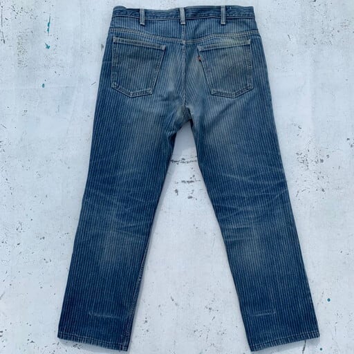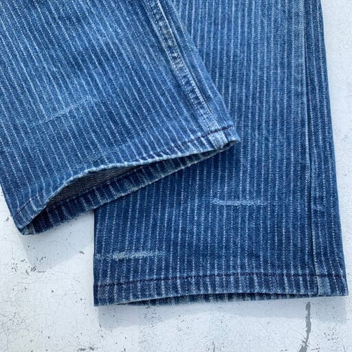 80年代のLevi's40509-0260ストライプデニムパンツです。ウォバッシュのようなこちらのデニムは、生地の織り方でストライプに見せる技法で製造されています。リブでいう針抜きのような織り方です。しっかりと穿き込まれヒゲや膝裏のハチノスも確認できます。股(お尻側)にタタキが入れられています。あまり見かけない変わり種デニムです。ウォバッシュ等がお好きな方は是非いかがでしょうか。